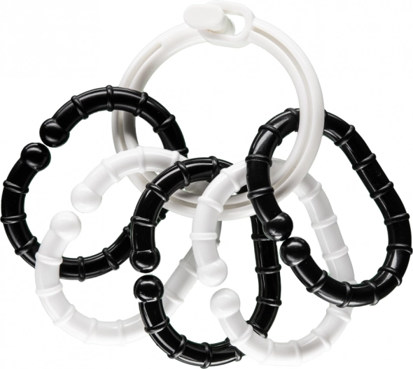 Kontrastfyldte sort-hvide ringe med vedhæng understøtter synsudvikling og finmotorik fra fødslen. De er lavet af kvalitetsplast og silikone, egnet fra 0+ og testet i henhold til EN 71 (dele 1–3 og 9) til sikker daglig brug.