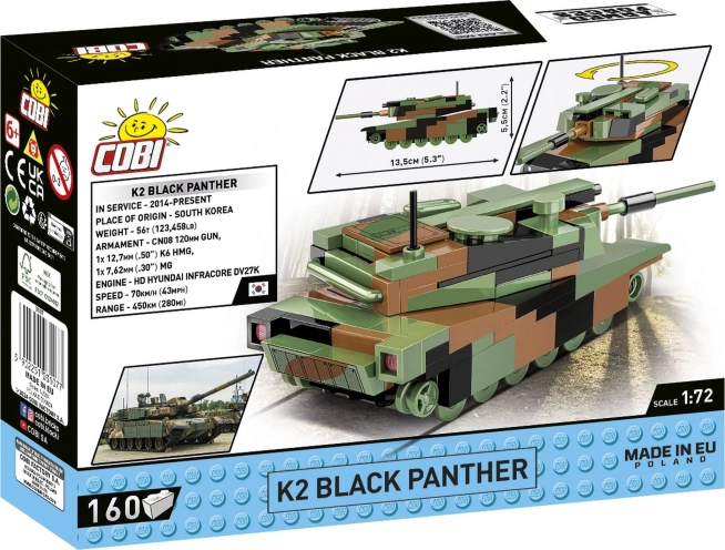 COBI K2 Black Panther byggesæt i skala 1:72, 160 klodser, med drejelig tårn. Kvalitetsudførelse, kompatibel med andre mærker, ideel til samlere.