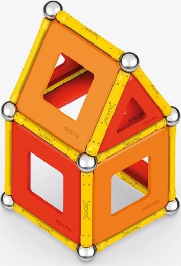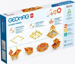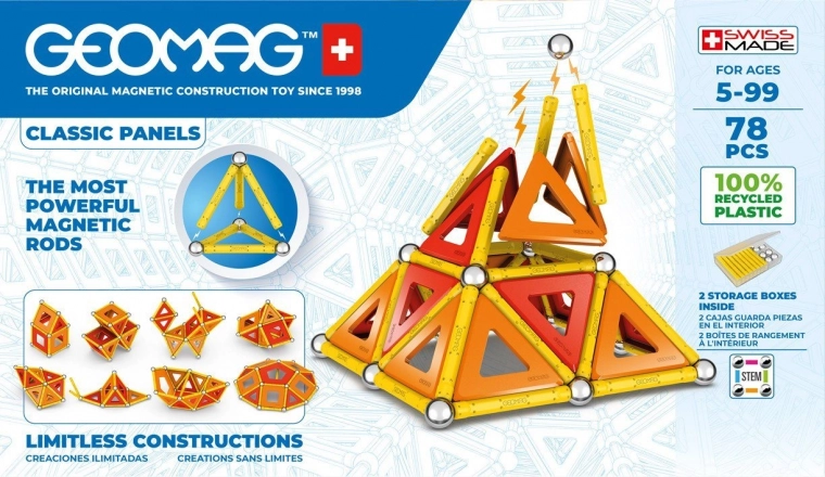 Oplev geometriens kraft med Geomag Classic Paneler. Dette magnetiske byggesæt indeholder 28 gule magnetiske stænger, 20 stålkugler, 16 trekantede paneler, 2 røde femkantede paneler og 12 kvadratiske paneler. Der medfølger også en praktisk plastboks til kugler og stænger.