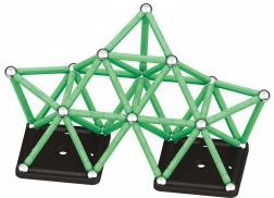 Sættet indeholder firkantede og femkantede baser til at skabe alsidige modeller – fra stjerneformer til komplekse geometriske konstruktioner.