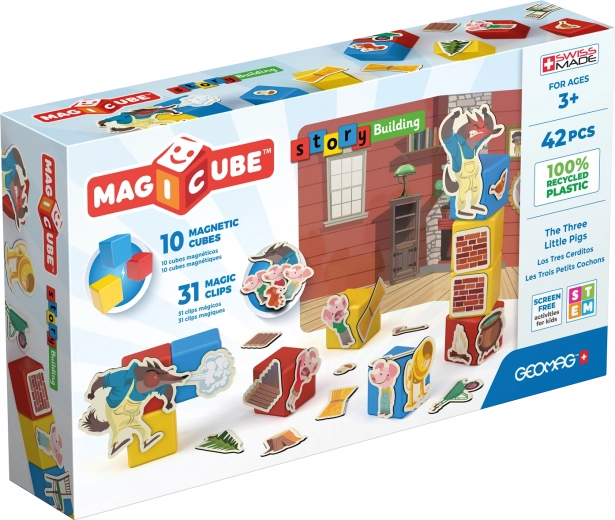 Geomag Magicube De tre små grise er et kreativt magnetisk byggesæt, der kombinerer højtlæsning af eventyret med interaktiv bygning. Med magneter på alle sider af klodserne kan børn nemt samle figurer, huse og scener og udvikle finmotorik, fantasi og logisk tænkning.