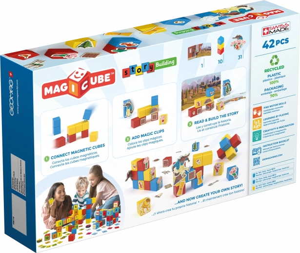 Opdag det smarte byggesæt Geomag Magicube inspireret af eventyret De tre små grise. Magnetiske klodser tiltrækker fra alle sider, så børn nemt kan bygge og skabe deres egne historier ved hjælp af 31 tematiske klips. Indeholder tekst på tjekkisk og slovensk. Schweizisk kvalitet, sikre materialer og lang levetid.