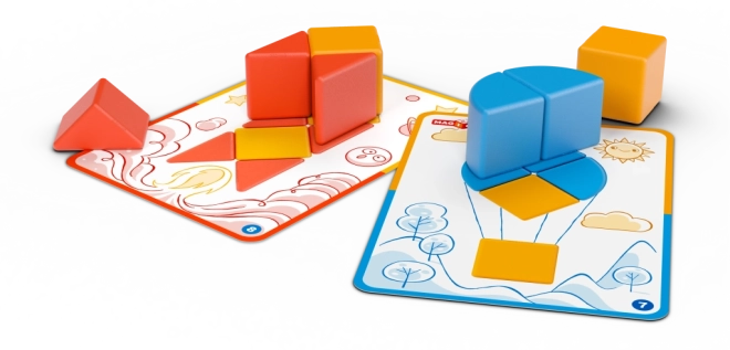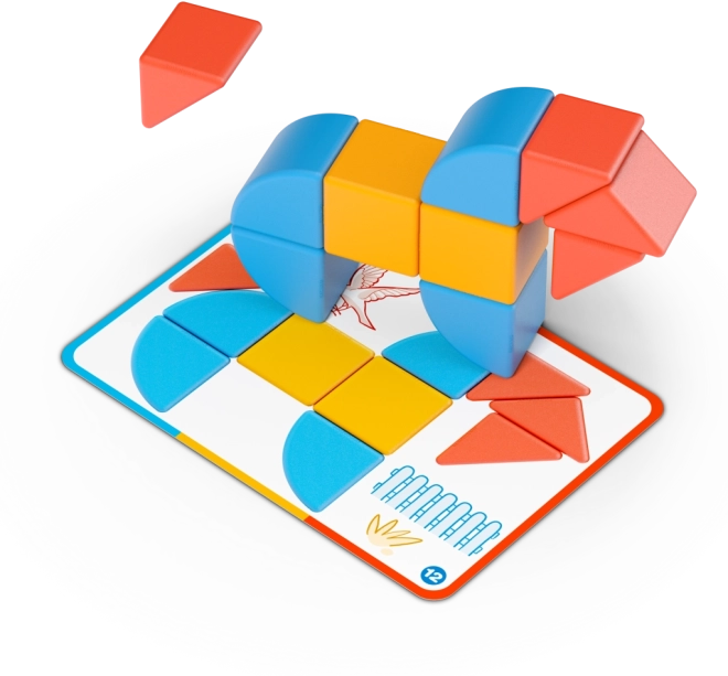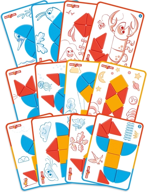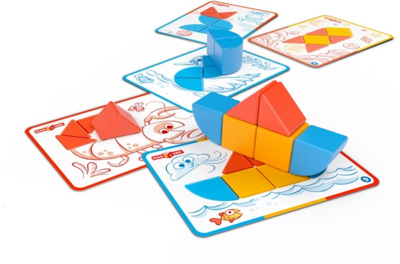 Der medfølger 6 tosidede kort med 12 opgaver, der fører fra simple puslespil til mere avancerede former og stimulerer logisk tænkning.