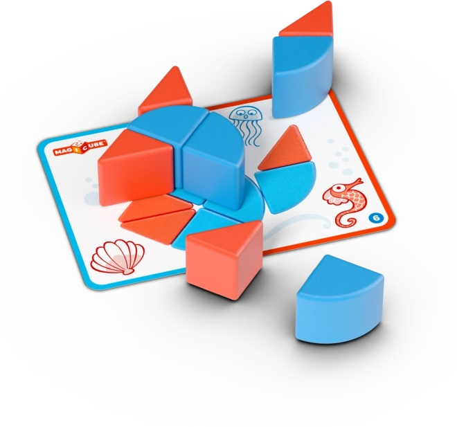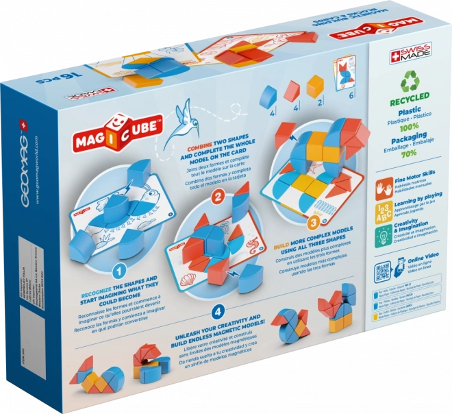 Geomag Magicube Shapes introducerer børn til former og konstruktion gennem leg. Takket være den smarte magnetteknologi tiltrækkes delene fra flere sider, så bygningen bliver intuitiv, sjov og motiverende for videre udforskning. I pakken finder du tosidede idé-kort, der trin for trin leder fra enkle billeder til mere komplekse projekter.