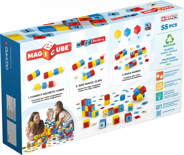 Geomag Magicube Words er en smart og legende måde at introducere børn til bogstaver og de første ord. De magnetiske klodser forbinder fra alle sider, så byggeri er intuitivt og sjovt. Børn kan skabe både 2D- og 3D-konstruktioner og samtidig træne sproglige færdigheder.