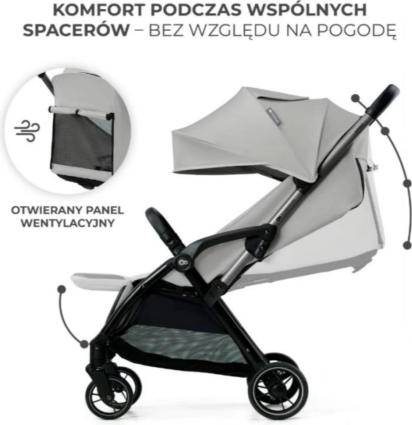 APINO har 4-trins justering af ryglænet til liggestilling samt justerbar fodstøtte. Klapvognen er også udstyret med en stor kaleche med ventilationspanel og kighul til kontakt med barnet, så du altid kan holde øje med din lille.
