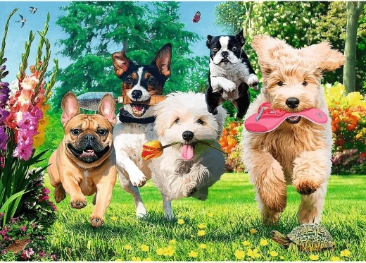 Legende hunde i en blomstrende have bringer energi, følelser og en detaljeret illustration, som glæder både begyndere og erfarne puslespilsentusiaster.