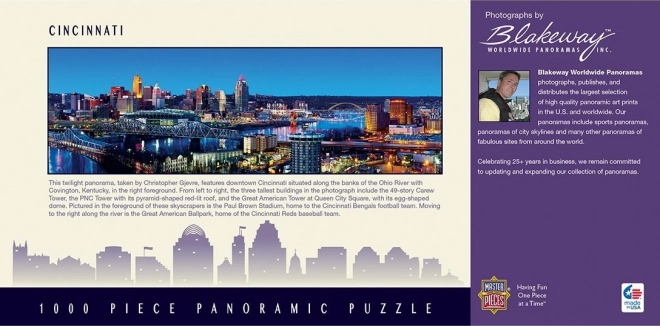 Oplev skønheden i den amerikanske metropol med det panoramiske puslespil MASTERPIECES “Cincinnati, Ohio” med 1000 brikker. Serien Cityscapes byder på strålende farver, præcis udførelse og solide brikker, der passer perfekt sammen. Fremstillet af genanvendt og genanvendeligt materiale.