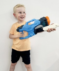 Det holdbare plastdesign, det ergonomiske håndtag og aftrækkeren med jævn gang sikrer komfortabel og sikker brug. Det futuristiske design i blå-sort udførelse tiltaler både små og store krigere og opmuntrer til aktiv bevægelse i frisk luft.