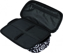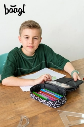 Penalhuset praler af et sort-hvidt tekstiludseende med abstrakte mønstre og teksten 'Baagl'. Dets stilfulde design er ideelt for dem, der værdsætter mode selv i skoleartikler.