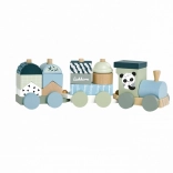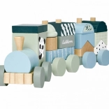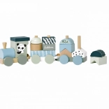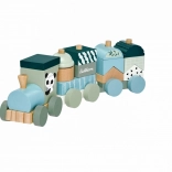 Lokomotivet og de to vogne med pinde gør det muligt for børn at stable og omarrangere 13 farvede klodser i forskellige former og mønstre – ideelt til at udvikle fantasi og finmotorik.