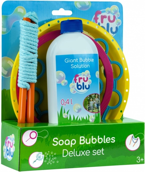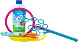 Deluxe sæbeboblesæt FRU BLU med 0,4 l opløsning giver en kompakt, let opbevaringsvenlig løsning til at lave små såvel som kæmpe bobler. Takket være nem samling, 3 udskiftelige mundstykker og den medfølgende 0,4 l opløsning får både børn og voksne maksimal udendørs sjov til fester og i hverdagen.