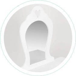 Skab børnenes eget lille skønhedshjørne. Dette hvide sminkebord med hjertespejl passer smukt ind i ethvert børneværelse. Holdbar og stabil konstruktion i træ og MDF sikrer lang levetid, mens glatte overflader er lette at holde rene.