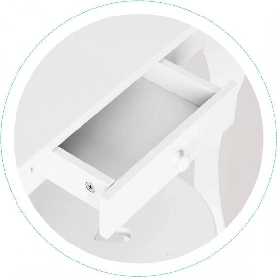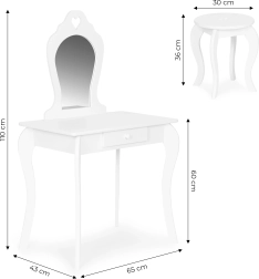 Takket være den rumlige skuffe er alt inden for rækkevidde – pynt, hårelastikker og små skatte. Den store arbejdsflade giver masser af plads til at børste hår, lege makeup eller kreative aktiviteter. Den komfortable skammel matcher bordet og sikrer korrekt siddestilling.