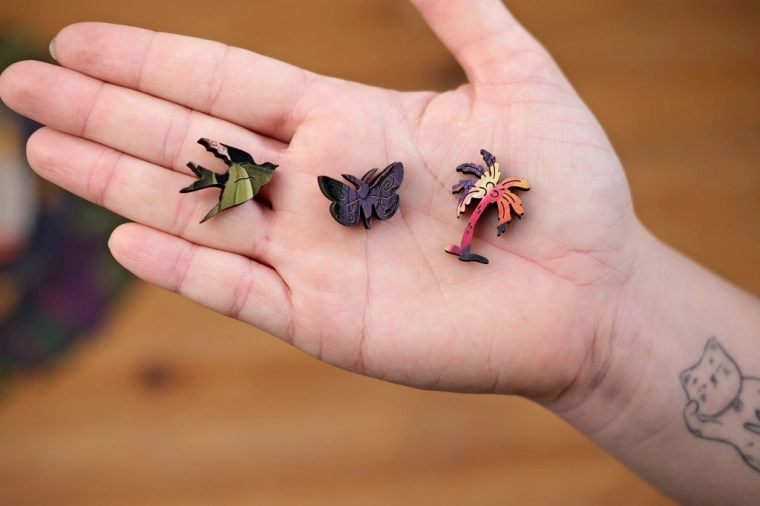 Hver brik er præcist laserskåret af 5 mm træ. Unikke former, inklusive tematiske silhuetter, gør samlingen sjov og vanedannende.