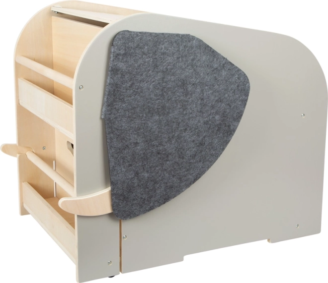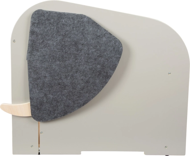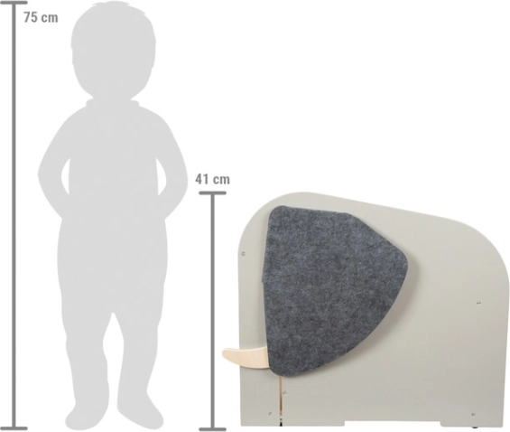Kassen tilbyder generøs plads til opbevaring af selv større legetøj, frontlommer til bøger og skriveredskaber og rummer en udtrækkelig stang mellem “tænderne” til ophængning af papirrulle til tegning. Kvalitets filtører skjuler hemmelige åbninger, den drejelige “elefanthale” fungerer som et bekvemt håndtag til åbning og lukning og kan gemme småting.