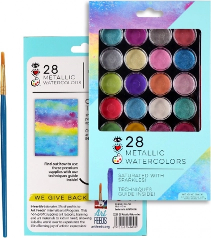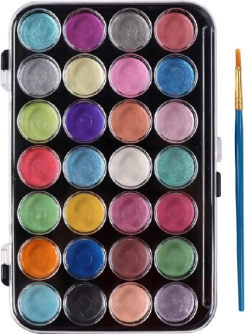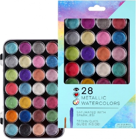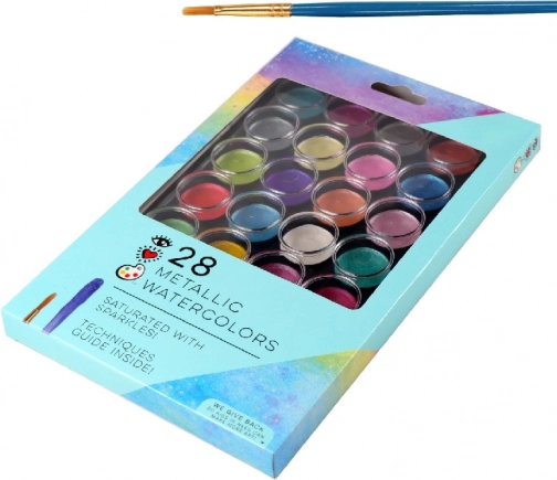 Opdag uendelige muligheder for leg med farver og skab dine egne originale billeder. Dette praktiske, kompakte sæt med 28 akvarelfarver i smukke metalliske nuancer gør det muligt for alle at udtrykke deres kreativitet. Sættet er lukket i et plastiketui, som beskytter farverne mod udtørring og gør dem nemme at bruge i hverdagen. Sættet indeholder en pensel og en kort guide til akvarelteknikker. Takket være den lærer alle at kombinere farver og skabe nye nuancer. Det er en ideel gave til børn, venner, til alle der kan lide at male.