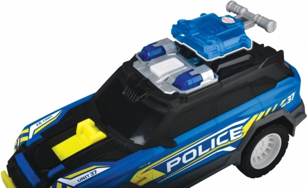 Politibil SUV uden motor, med lys- og lydeffekter. Udstyret med disk-affyrer og en udtrækkelig krog i bilens front. Try Me-funktion, batterier medfølger. Længde 30 cm, alder 3+.