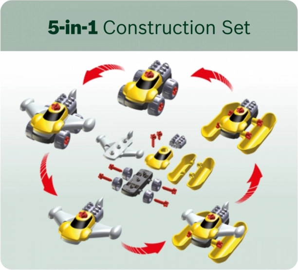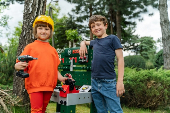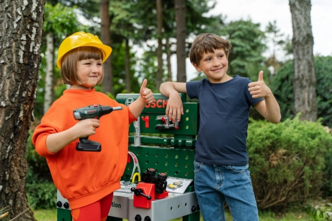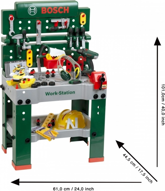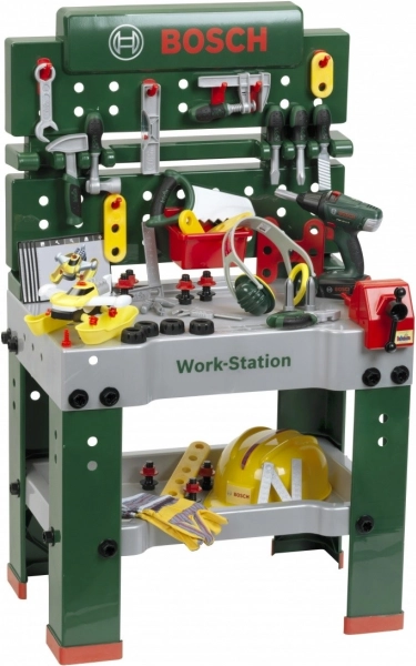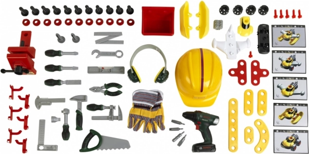 Det fuldt udstyrede børnearbejdsbord er fremstillet i Tyskland under Bosch-licens. Bordpladen tilbyder en række luftfunktioner, en skruestik samt praktiske opbevaringsrum og en aflægshylde. På bagvæggen af arbejdsbordet og på hylden under bordpladen er der plads til det kvalitetsprægede tilbehør med 81 dele, hvoraf nogle kan hænges på væggen ved hjælp af praktiske kroge: børnevenlig elektrisk akkuboremaskine/skruetrækker, kærv- og krydskærvsskruetrækker, nøgle, skiftnøgle, tang og fil, hammer, sav og målebånd, vinkel, lineal og skruetvinge. Børnene lærer at håndtere skruer, møtrikker og skrueelementer i forskellige størrelser og former på en sikker måde takket være legetøjshjelme og beskyttelsesbriller, kølende høreværn og handsker. Særligt sjov er det selvsamlende køretøj, som kan drejes og vendes på arbejdspladsen igen og igen. Børneværelset bliver dermed til et værksted! Det er bare at tage hjelm og beskyttelsesbriller på, trække handskerne på og gå i gang med at save, hamre og skrue. Ihærdige designere får hjælp af skruestikken, som holder lister, der skal fastgøres med søm eller skruer. Der er også en akkuboremaskine/skruetrækker, som med lys og lyd skruer alt det sammen, som de små vil bygge til noget stort, og når arbejdet er færdigt, kan alt hurtigt organiseres på kroge og i kasser.