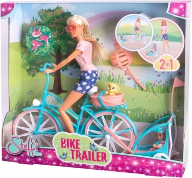 Steffi på cykel med anhænger, inklusive barn, hund og hjelm.
