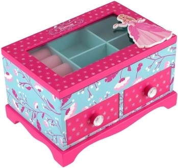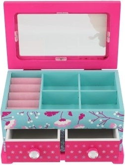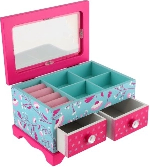 Elegant barns smykkeskrin i kvalitets træ med opklappeligt låg og to skuffer er ideelt til opbevaring af smykker og små skatte. Det udmærker sig ved et farverigt design med blomster- og fuglemotiv i pink-blå kombination samt pynt med prinsessemotiv. Den praktiske indvendige opdeling og det integrerede spejl gør den nem at bruge i børneværelset til hverdag.
