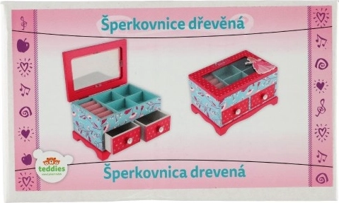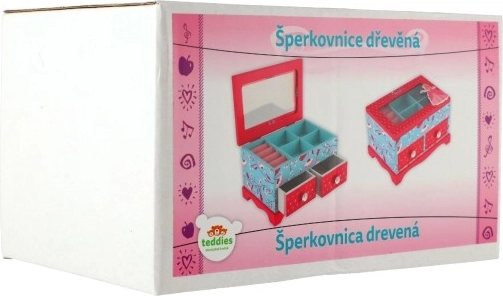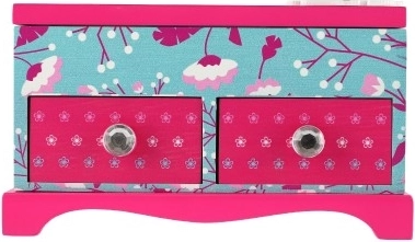 Overfladen på smykkeskrinet prydes af fine blomster- og fuglemotiver i en kombination af pink og turkisblå, som smukt komplementerer ethvert børneværelse. Takket være den robuste træforarbejdning og de glatte greb er den nem for børn at håndtere. Ikke legetøj – egnet som dekorations- og opbevaringsgenstand.