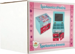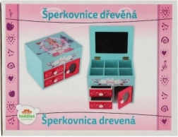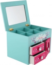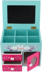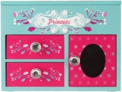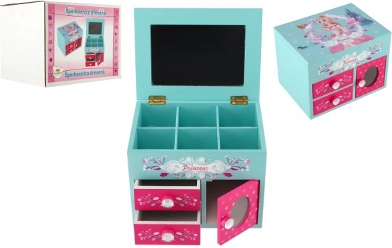 Dette charmerende træsmykkeskrin i turkis-rosa med prinsesse- og blomsterdetaljer er en skøn løsning til organisering af ringe, øreringe, armbånd og små hemmeligheder. Under det vipbare låg med spejl finder du inddelte rum for dagligt overblik og hurtig udvælgelse.