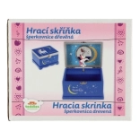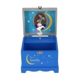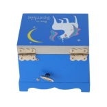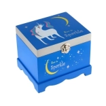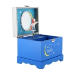Dette træ-smykkeskrin i en fortryllende blå farve er det perfekte sted til opbevaring af små skatte, ringe og armbånd. Låget med spejl gør det nemt at tjekke looket, og når nøglen trækkes op, roterer enhjørningen indeni, mens en blid melodi spiller.