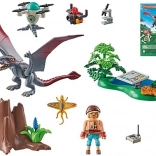 Sættet indeholder en PLAYMOBIL-figur, en Dimorphodon, en flyvende øgle, en drone med kamera, et mikroskop, en dam med planter og mange andre fantastiske tilbehør.