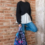 Et markant, abstrakt motiv i nuancer af lilla, blå og rosa giver dit outfit kant og sikrer, at posen ikke bliver overset.