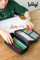 Leder du efter et pålideligt og elegant penalhus, der holder alting pænt organiseret? BAAGL Darkness kombinerer et minimalistisk design med en gennemtænkt indvendig inddeling. Den udklappelige skillevæg, elastiske holdere og lynlåslommen sørger for orden i blyanter, kuglepenne og små tilbehør. Den transparente lomme til skema hjælper med at planlægge skoledagen bedre.