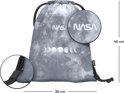 Stilfuld sportspose med NASA-motiv i et gråt, måneinspireret design – ideel til sko og småting i fritiden. Den er lavet af robust, aftørringsvenligt materiale og har slidstærke snore til lukning og samtidig komfortabel bæring på ryggen. Praktisk, let og nem at vedligeholde til daglig brug.