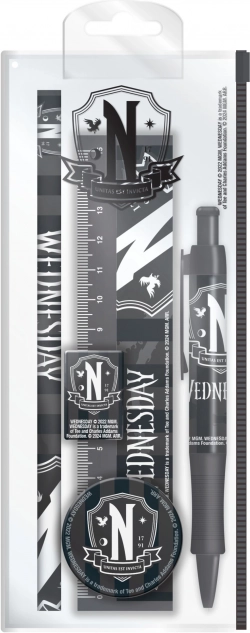 Dette lille skolesæt er ideelt til enhver fan af serien Wednesday. I det praktiske plastetui finder du alle vigtige skoleartikler: