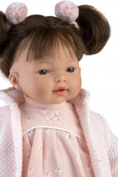 Dukken bærer et matchende sæt kjole, striktrøje og sokker. For endnu mere leg kan du tilkøbe originalt Llorens-tøj til dukker i størrelse 33 cm.