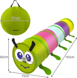 Den søde børnetunnel i larveform begejstrer små opdagelsesrejsende. To ind-/udgange og en blød tekstilkonstruktion indbyder til gemmeleg, kravlen og små konkurrencer. Takket være den fleksible stålramme foldes tunnelen ud af sig selv, og efter legen kan den nemt foldes sammen igen i det kompakte etui.