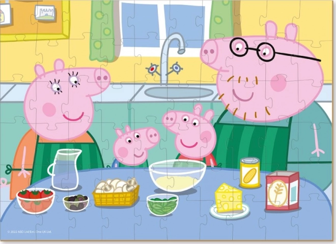 Børnepuslespil Gurli Gris – Fælles madlavning, 60 brikker. Færdigt mål ca. 32 × 23 cm. Sjov for børn og udvikling af finmotorik.
