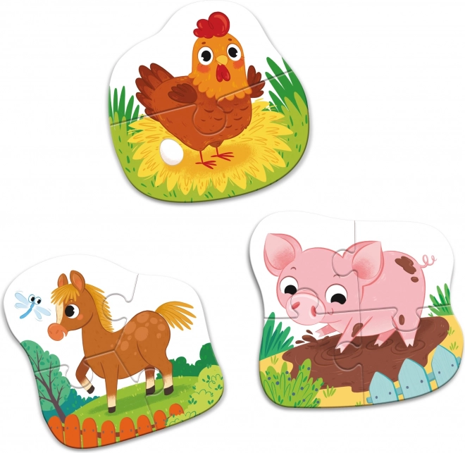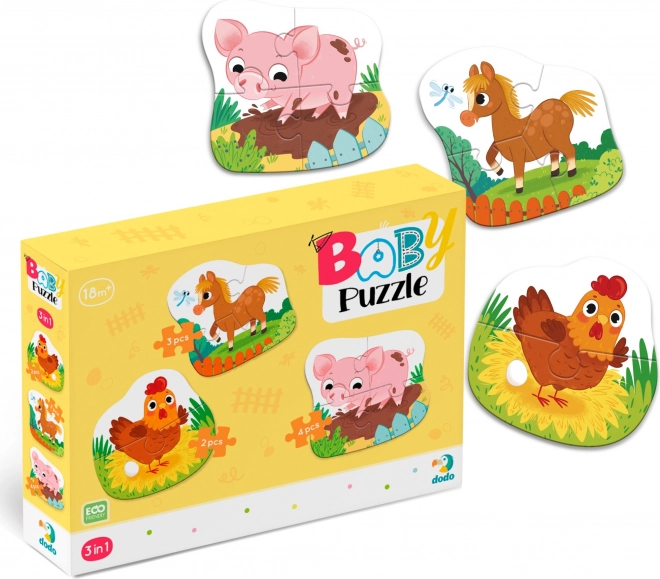 Denne baby-puslespilsæt er et ideelt valg til børns første møde med puslespil. De tre separate konturbilleder af gårdens dyr har forskelligt antal brikker (2, 3 og 4), så barnet gradvist kan blive bedre og opleve glæden ved succes hver gang et billede er samlet.