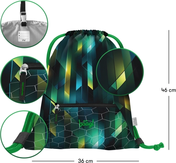 Takket være den integrerede karabinhage kan posen hurtigt fastgøres til en skoletaske eller rygsæk. Den nederste lynlåslomme opbevarer sikkert nøgler, penge eller chip, mens de kraftige snore gør det nemt at lukke og bære den på ryggen som en lille rygsæk.