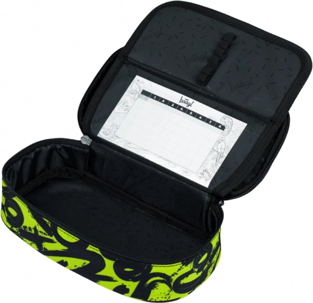 Penalhus med udklapbar skillevæg, lynlåslomme og plads til skema (uden indhold). Den vaskbare pose med snørelukning kan bæres på ryggen.
