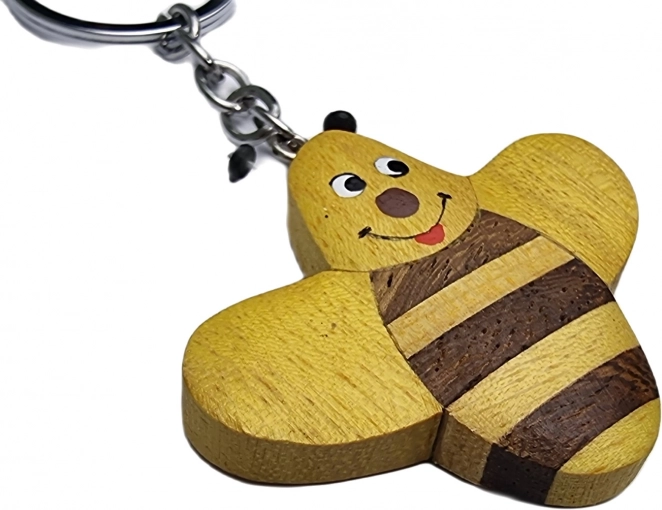 Oplev charmen ved naturmaterialer med bi-nøglevedhænget fra 2KIDS TOYS. Hver del er unik – håndlavet af op til fem typer farvet træ (gul brødfrugt, lysebrun tamarind, mørkebrun kassia, rosa aniba, hvid gmelina arborea). Selve træet er ikke farvet, men har naturlig farve, som fuldendes af diskret håndmaling.