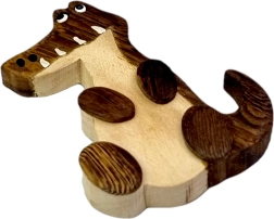 Denne originale træmagnet med krokodille udmærker sig ved præcist håndværk og en unik kombination af naturligt farvede træsorter. Hvert stykke er unikt – træet er ikke farvet, kun let håndopmalet for fine detaljer.