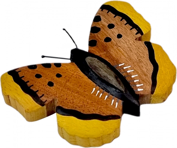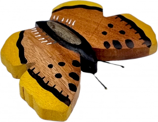 Håndlavet, naturlige materialer og et smukt sommerfuglemotiv – denne træmagnet pynter på både køleskab og magnettavle. Den er sammensat af op til fem træsorter og kun håndopmalet, så dens naturlige farver, præcise udførelse og originale design træder frem. Et fremragende dekorativt element og en lille gave til naturelskere.