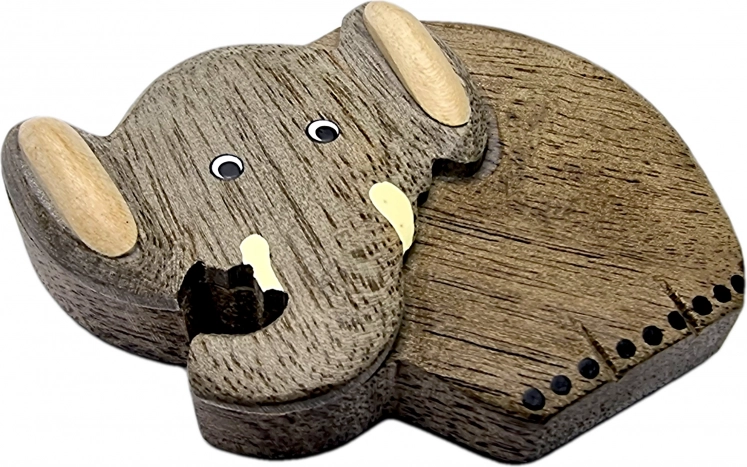 Denne stilfulde elefantmagnet er håndlavet af en kombination af forskellige eksotiske træsorter, hvis naturlige nuancer skaber et unikt mosaiklook. Træet er ikke farvet – kun let opmalet for at fremhæve detaljerne, så du får glæde af dets autentiske naturlige tekstur og farve.