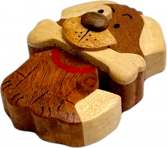 Denne store træmagnet med hund og knogle kombinerer solidt håndværk og naturlige materialer. Hvert stykke er omhyggeligt sammensat af træ i forskellige nuancer og kun håndmalet – uden fulddækkende farvelægning, så træets naturlige åretegning træder frem.