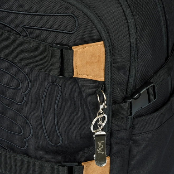 To forreste stropper til fastgørelse af skateboard, slidstærkt vandafvisende materiale og pålidelige YKK-lynlåse. Inkluderer også en metalvedhæng formet som et skateboard.