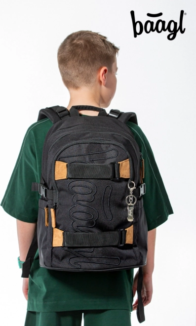 Skoletaske-sættet Baagl 3 SET Skate Darkness er designet til maksimal komfort, organisering og sikkerhed. Ergonomisk formet ryg, fuldt justerbare skulder-, bryst- og side-kompressionsremme sikrer perfekt tilpasning til kroppen. Rygsækken har tre separate rum med organiser, polstret lomme til 15" bærbar eller tablet samt sidelommer til flaske.
