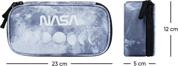 Penalhuset af genanvendt materiale er af etui-typen med udklappelig skillevæg, lynlåslomme og rum til skema. Posen med NASA-motiv er lavet af et stærkt, aftørringsvenligt materiale og kan bæres på ryggen takket være snorene. Hele sættet er designet til daglig brug og er testet på et akkrediteret laboratorium.