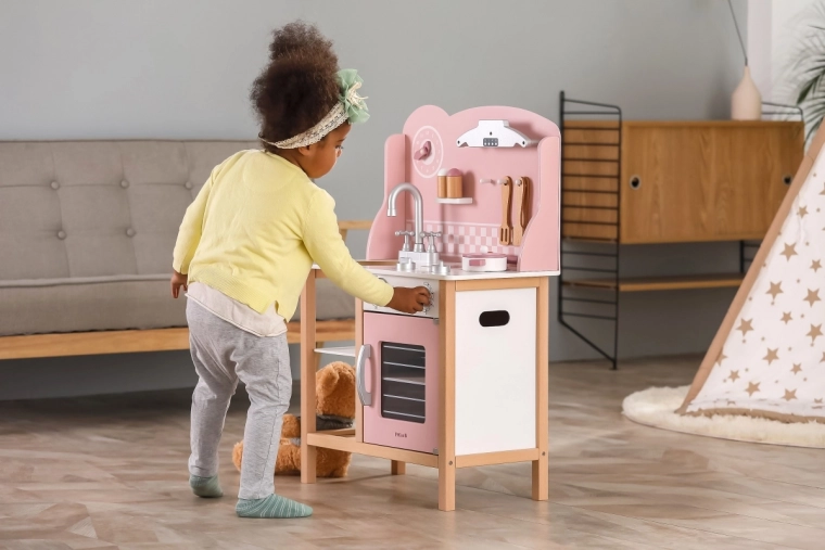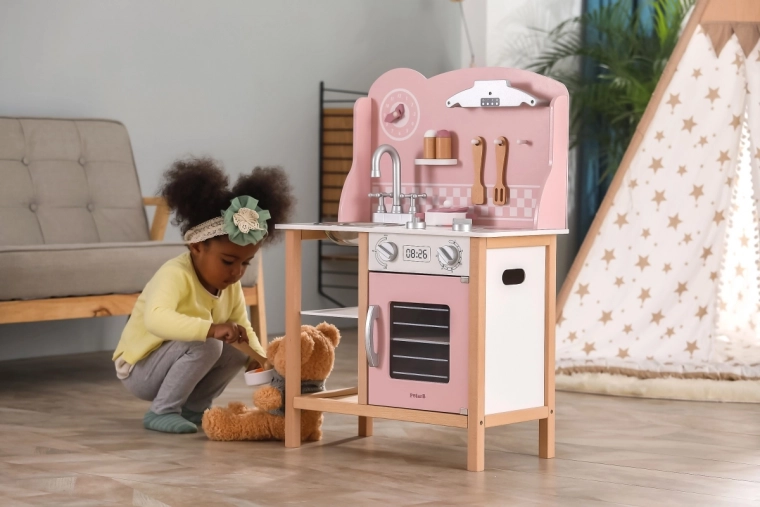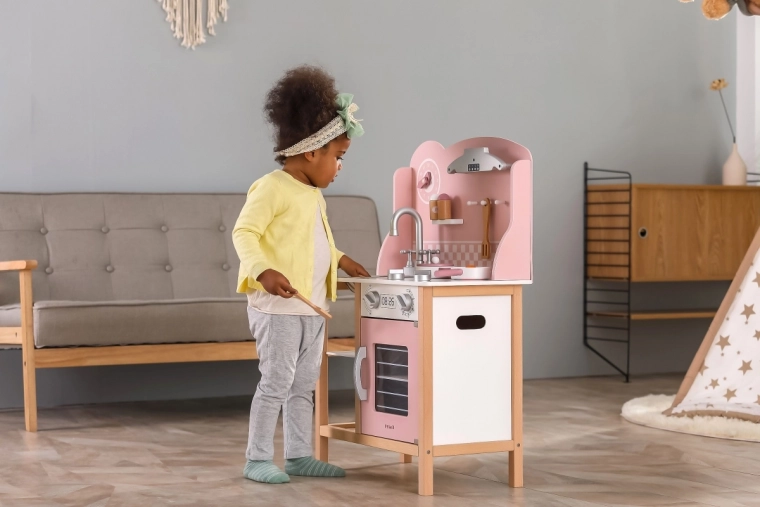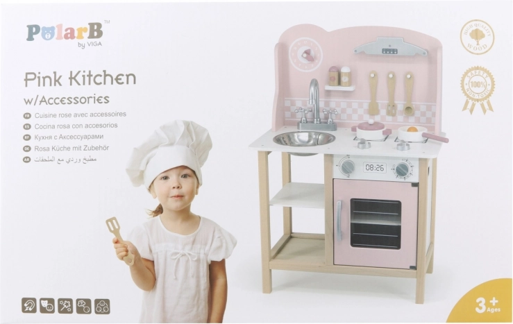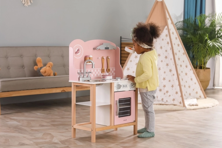 VIGA PolarB-legetøjskøkkenet i en blid rosa-hvid kombination understøtter kreativ leg, selvstændighed og sociale færdigheder. Takket være de realistiske elementer – fra vask med armatur og ovn med låger til drejeknapperne med det karakteristiske “klik” – kan børn prøve, hvordan det er at lave mad, bage og rydde op som de voksne. Den robuste trækonstruktion med glatte kanter og overflader behandlet med sikre, ugiftige farver sikrer lang holdbarhed og tryg leg.