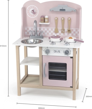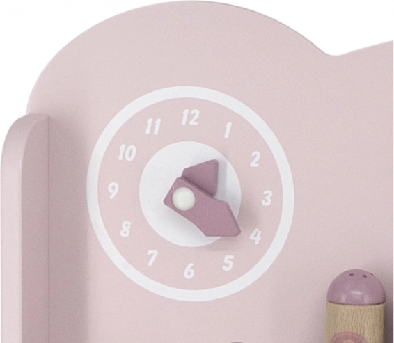 Der medfølger også praktisk opbevaringsplads med hylde, ophængskroge til redskaber og et ur til sjov tidslæring. Det rige tilbehør – gryde med låg, pande med spejlæg, ske, hulske, spatel, saltbøsse og peberbøsse – lader børn forberede en “menu” til hele familien.