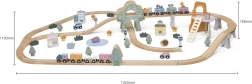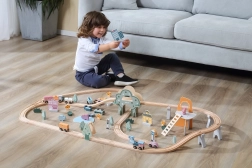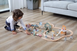Det omfattende sæt indeholder skinner, forhøjninger, en bro, tog med vogne og masser af tilbehør. Børn ændrer nemt ruterne og skaber nye historier hver gang de leger.